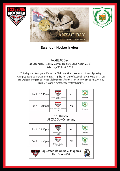 Essendon Hockey Club ANZAC Day Invitation Invitation for Essendon Hockey Club ANZAC Day hockey match vs Doncaster Hockey Club Share this: Click to share on X (Opens in new window) X Click to share on Facebook (Opens in new window) Facebook Like Loading... Related