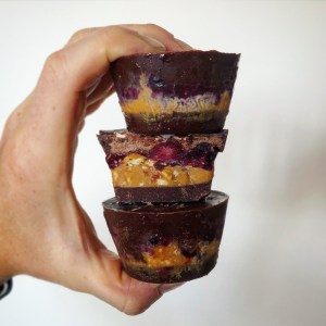 Once the chocolate base has set and the jam has cooled, you can begin assembling. Place one teaspoon of peanut butter in each cup, followed by a teaspoon of the jam. Top with more melted chocolate so that all the jam layer has been covered. Sprinkle with cacao nibs and coconut, if using.